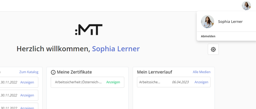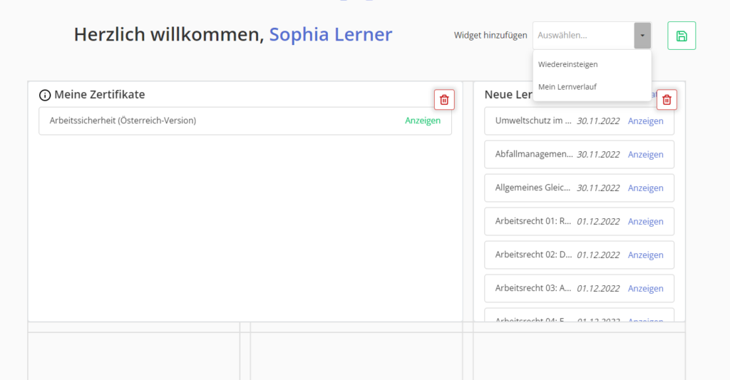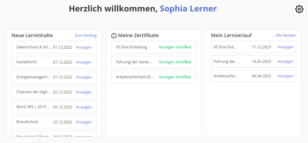 Am Dashboard finden Sie neben Ihren zuletzt besuchten Lernmedien eine Übersicht über Ihren Lernverlauf, Ihre Lernfortschritte und auch neue Lerninhalte aus dem Katalog. Außerdem werden Ihnen Ihre zuletzt erhaltenen Zertifikate aufgelistet. Es bietet Ihnen somit eine kompakte Übersicht über all Ihre Lernaktivitäten.