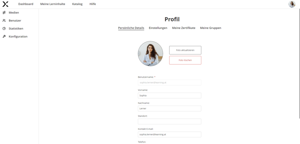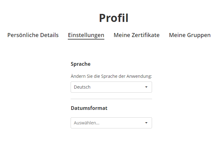 Sie finden Ihr Profil in der rechten oberen Menüleiste. Dort können Sie Ihre persönlichen Daten ändern, ein Profilbild hochladen und Ihre Spracheinstellungen treffen. Außerdem können Sie Ihre Zertifikate und Gruppen einsehen.