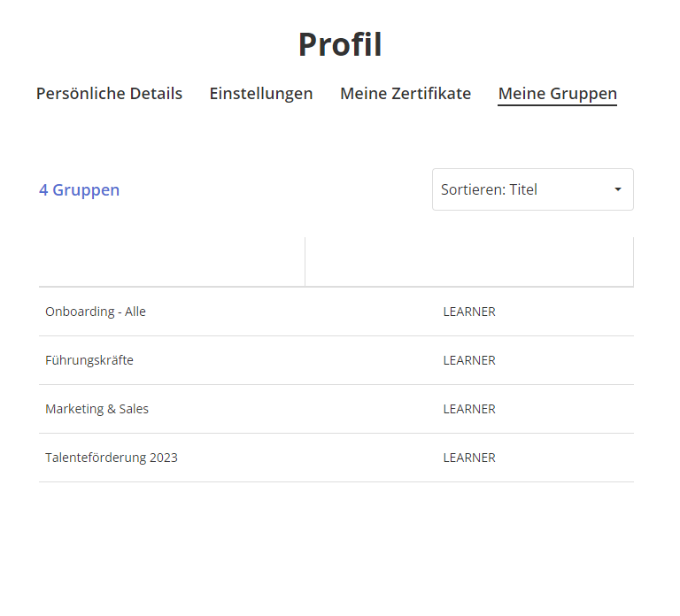 In Ihrem Profil können Sie außerdem sehen, welchen Gruppen Sie angehören. Diese werden von Ihrem:Ihrer Bildungsmanager:in zugewiesen.